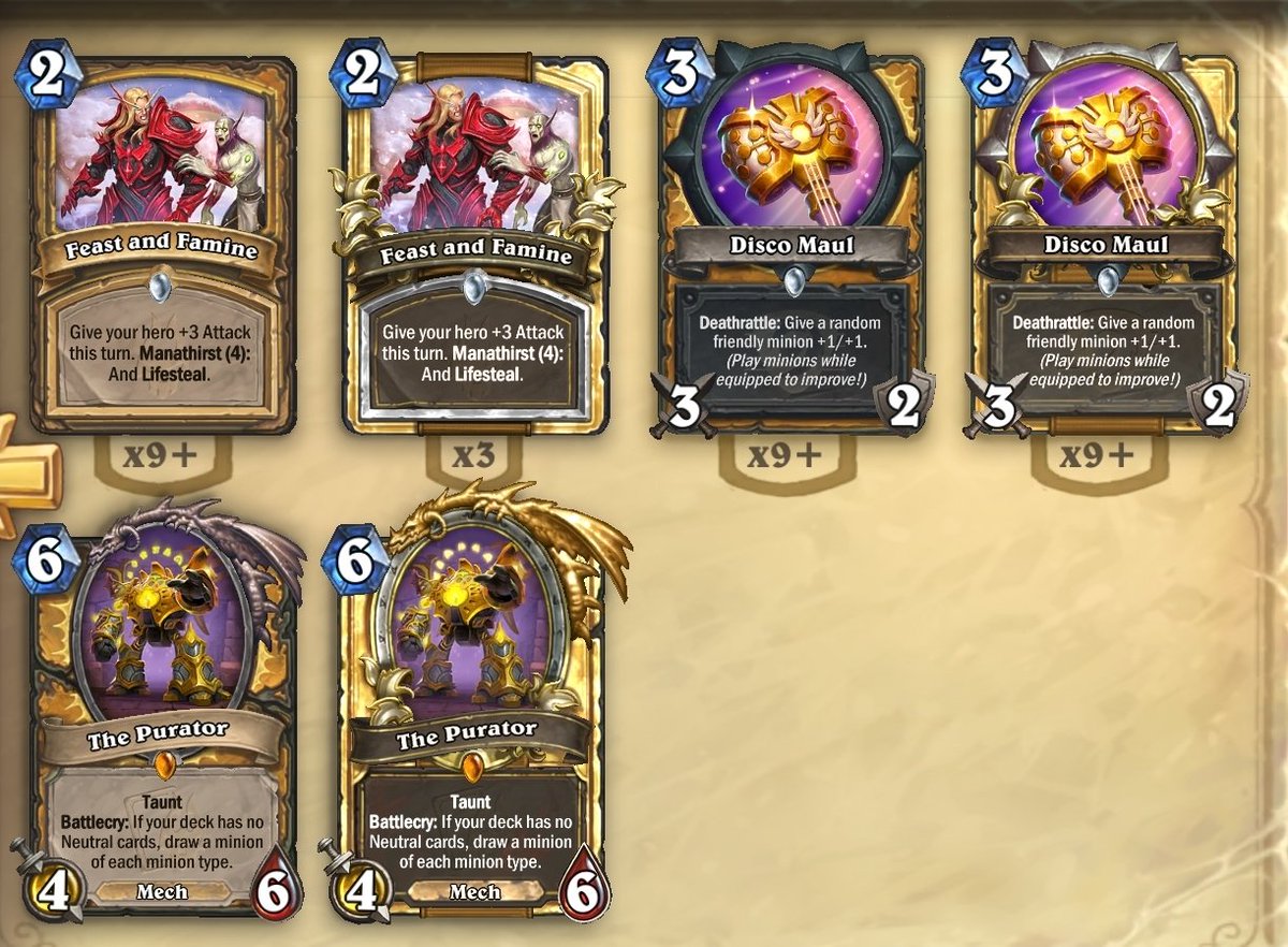 Eigentlich hab ich nur die Karten für richtig gute DK Decks, bei den meisten anderen Klassen fehlt zu viel um auch nur ein T2 Deck zu bauen… ![]()