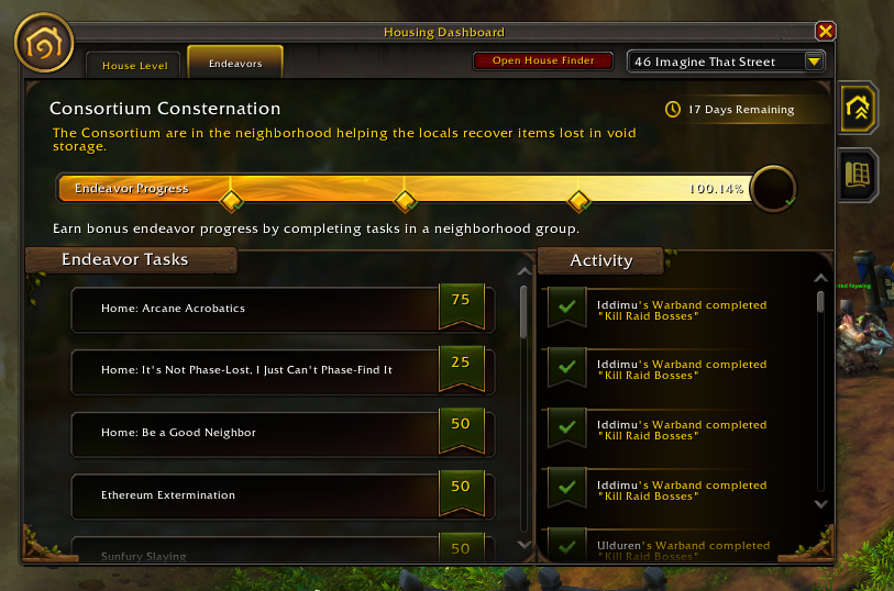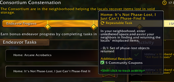 I’m on the Consortium and Mechagon endevours in my two neighbourhoods so I can’t comment on that one specifically. However most tasks I can find via the Endeavours panel.