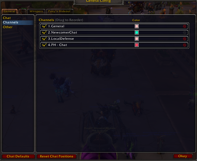 /run _CHATHIDE=not _CHATHIDE for i=1,NUM_CHAT_WINDOWS do for _,v in pairs{"","Tab"}do local f=_G["ChatFrame"..i..v]if _CHATHIDE then f.v=f:IsVisible()end f.ORShow=f.ORShow or f.Show f.Show=_CHATHIDE and f.Hide or f.ORShow if f.v then f:Show()end end end