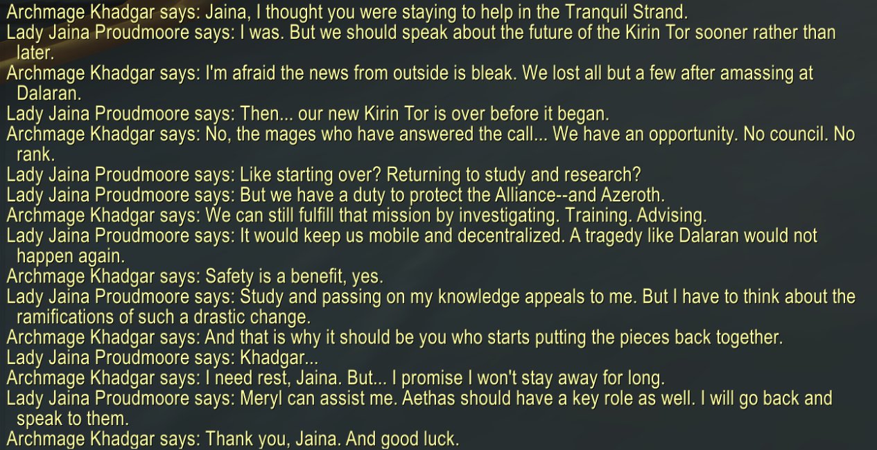 Jaina is Leader of the Reformed Kirin Tor and Khadgar is retiring from what we know now with the different text strings attached to the proper characters. Incredibly funny decision Blizzard, possibly the funniest option 10/10.