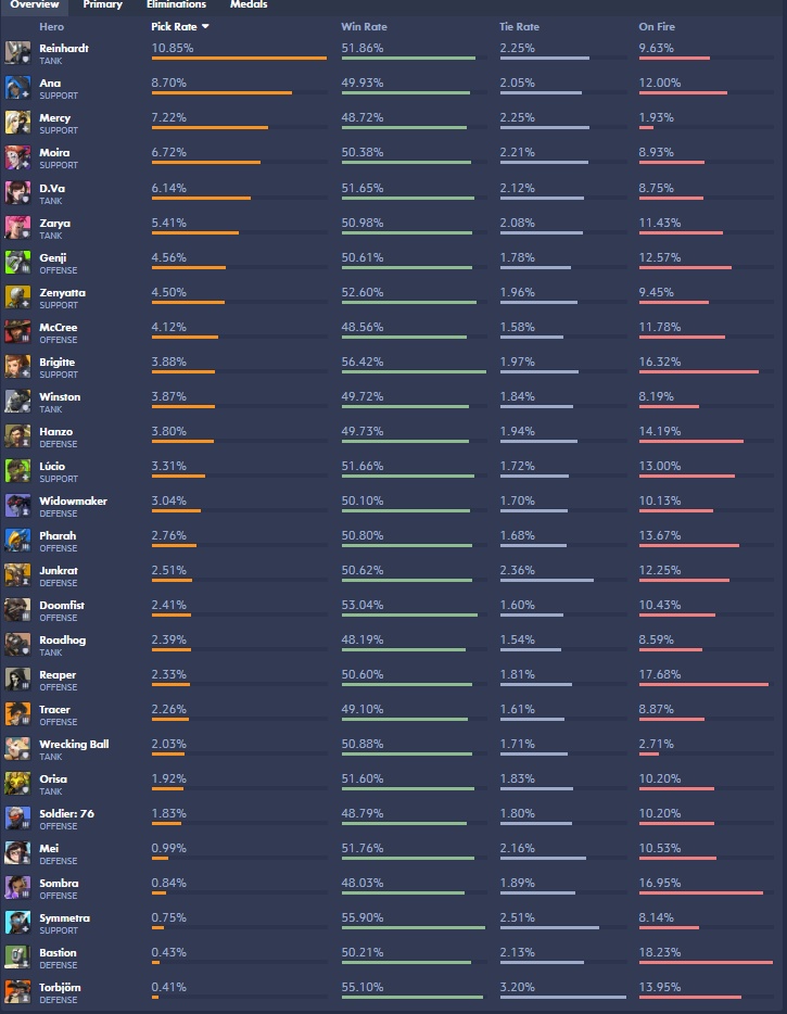 Decías que junkrat está olvidado porque no se juega. Pues se juega casi lo mismo que pharah o doomfist. Definitivamente más que tracer/mei/sombra. Te dejo una captura de los pickrates en la media global de elos…